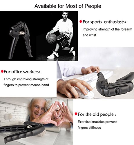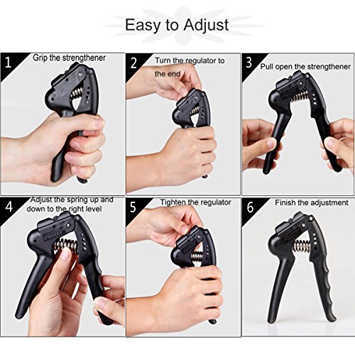 Studio : Webberstore Publisher : Webberstore Binding : Misc. Product Description The Hand Grip Strengthener is Perfect for: - Those required to do physical therapy endurance and strength building exercises.Suffers of arthritis and tendinitis. - Guitar,Piano,Violin,Drum and other instrument player that wants to play more effectively and comfortably. - People that play sports and are looking to increase their hand, wrist and forearm strength. - Anyone who is recovering from any hand, wrist or forearm injury. Great for rehabilitation. - People looking to increase muscle strength in the hands,fingers,wrist and forearms to fix muscle imbalance and avoid injury. Product Features: - High quality stainless steel tension springs provide long lasting durability - Easily adjust resistance levels from 22-70 lbs (10-32 kg) - Comfortable anti-slip handles fit any hand size - Small enough to into a pocket, backpack or gym bag,easy to carry - Anti-slip Handle with Humanized Design Makes It More Comfortable and Safer for Long Time Training - The extra-large spring is made of high tenacity material which is durable and rustless Easy to Use - Grip the strengthener - Turn the regulator to the end - Pull open the strengthener - Adjust the spring up and down to the right level - Tighten the regulator - Finish the adjustment - For sports?enthusiast: Improving strength of the forearm and wrist - For office worker:Through improving strength of fingers to prevent mouse hand - For the old people :Exercise knuckles,prevent fingers stiffness hand grip strengthener strength trainer adjustable resistance
