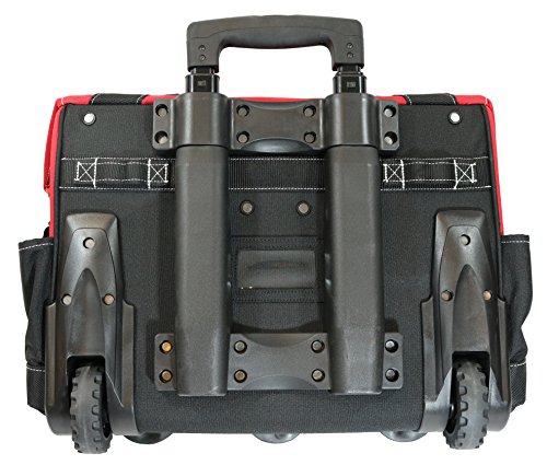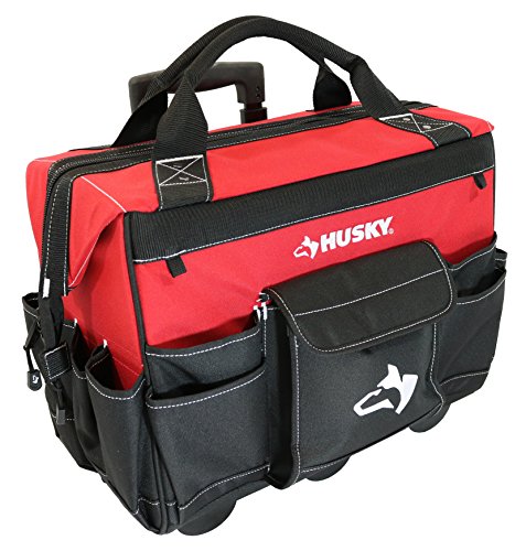 Studio : Husky Publisher : Husky Product Description This Husky 18 in. Rolling Tool Tote features a heavy-duty telescoping handle and wheels for easy maneuvering and mobility. Its large main compartment allows easy access to tools, while 7 internal and 11 external pockets provide for organized tool storage. It also features a dual-zipper top and 2 tape measure loops. This portable tool tote is made of 600 denier Spun Tuff, water-resistant material. 0