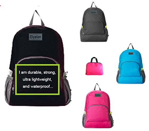 DURABLE & LIGHTWEIGHT: The Elysian Backpack is made of high quality waterproof nylon. It is both durable and strong. While it weighs just 8.11 ounces, it can hold up to 41 lbs. of goods and is a perfect choice for all outdoor activity and for frequent travelers. / WATERPROOF: Your search for that perfect waterproof backpack is over. This backpack keeps your stuff dry and safe in the rain and snow. / COMPACT & CONVENIENT: It folds into its pocket and unfolds into backpack in seconds. Keep it folded in your suitcase for city tours and trips. Carry one along when you need your hands free for taking that perfect photo shot. / BEST TRAVEL BUDDY: The Elysian backpack is a must have for all travelers. Keep one folded in your suitcase to be used later at your destination. You can now avoid those pesky weight-related airline charges simply by pulling it from your lage, unfolding it, and transferring the excess baggage from your suitcase into the backpack. / MULTIPURPOSE: The Elysian Backpack is your super hero... Simply the best multipurpose backpack you will ever own and be happy with. It is foldable, packable, and easy to carry. It fits well in your suitcase or in your purse and is perfect as a daypack and for day trips and day hikes, for vacations, school, camping and shopping. It's a great gift for everyone on your list. An excellent travel buddy to tag along everywhere you go...parks, zoo, festivals, city tours, camps, cabins, biking, hiking.