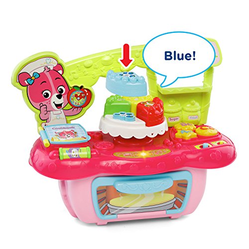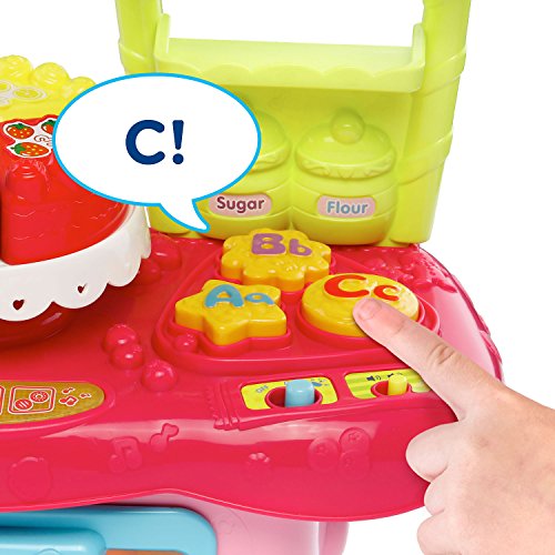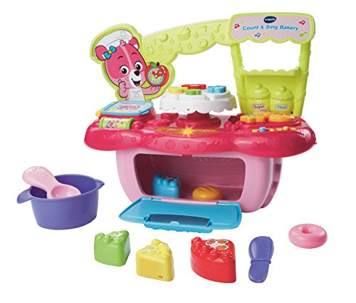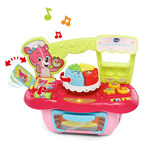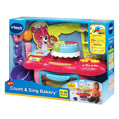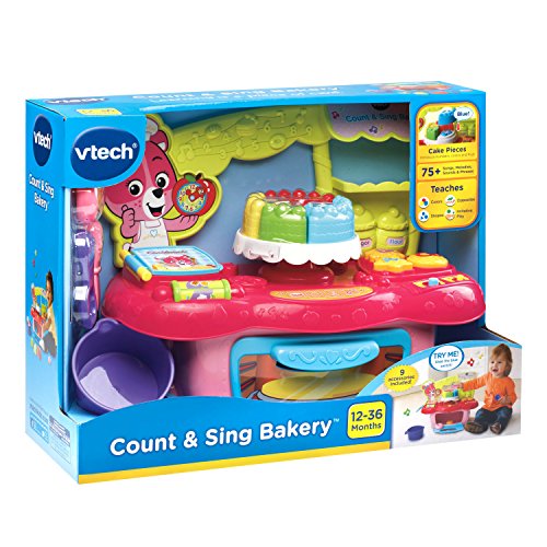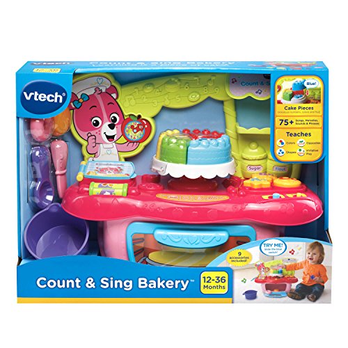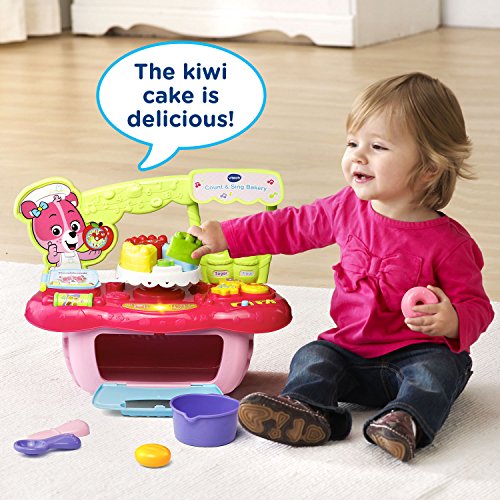 Stir up the fun with the Count and Sing Bakery from VTech. Pretend to mix ingredients together to make a colorful cake, and then bake it in the toy oven. When the cake is done, place the pieces on the interactive cake stand to learn about numbers, colors and fruit. Spin the cake stand around to hear fun sounds and music. Three cookie buttons play music and introduce shapes and letters. Turn the page of the cookbook and hear fun phrases and songs. The bakery also includes a bowl, spoon, knife and food pieces to encourage imaginative play. Requires 2 AA batteries (batteries included for demo purposes only; new batteries recommended for regular use). Intended for ages 1 year to 3 years.Feature