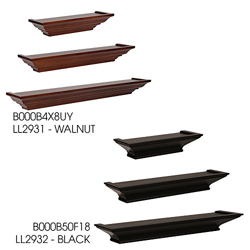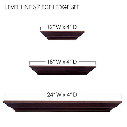 You'll never worry about crooked pictures, leaning ledges, or damaged walls again. With Level-Line, you can hang one picture or create a complete decorator look in just minutes ¿ even if you're a non-do-it-yourselfer. 3 piece Traditional Walnut Level Line ledge set. This complete decorating solution in a box includes a 12", 18" and 24" ledge. Create your own personal wall display using ledges together or separately. Level-Line comes with everything you need: Mounting bracket with built-in level, Hanging hardware, Living-room quality wood and laminate materials, Multiple, acid-free (archival quality) Flex-Mats, Easy-to-follow instructions and Decorating ideas. Whether you're handy or all thumbs, you'll love Level-Line because it requires only one set of hands, mounts in minutes, ensures a straight, level "hang", pulls wall décor flush to the wall, adjusts side to side, eliminates need for level, screwdriver, tape measure, ruler, spackle, and paint for repairing holes.Feature