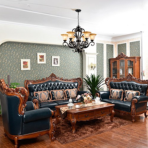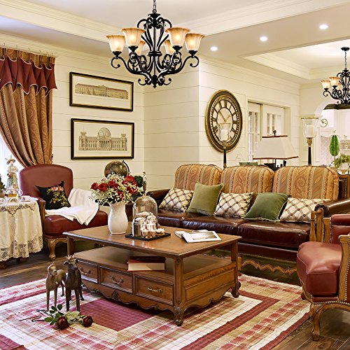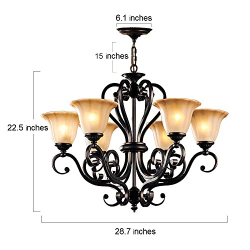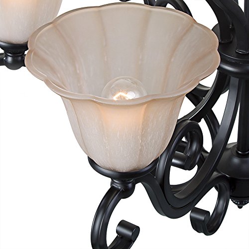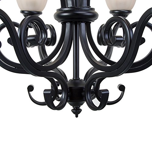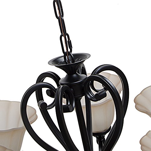 This elegant chandelier features a dynamic design of scroll arms frame and frosted glass shades. Six glass uplights are arranged on the frame, offering soft and warm lighting. The durable iron construction with black finish can complement any home styles. This gorgeous chandelier illuminates most directions of your room spaces, making it a must option for your living room, dining room or bedroom.