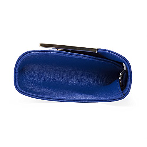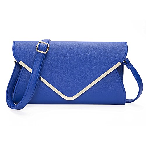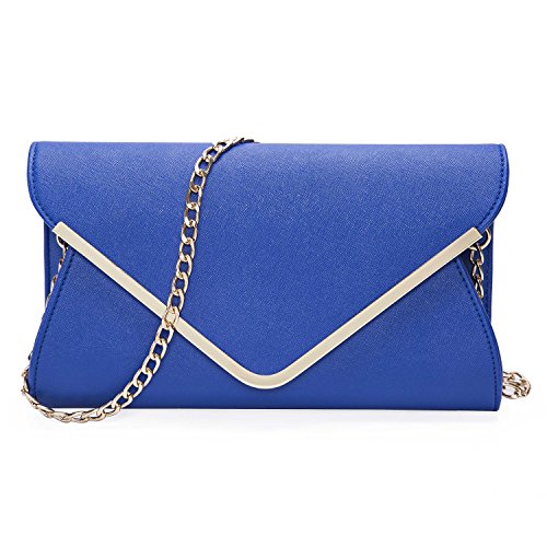 FEATURES: Royal blue leather chain envelope clutch. The bag features a magnetic closure, two flat pocket and one zipper pocket. The bag can be worn either with a short chain carry on the shoulder or long chain carry across the body.