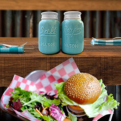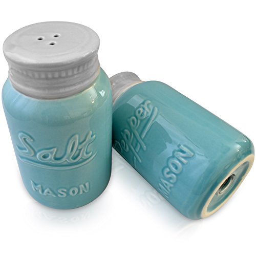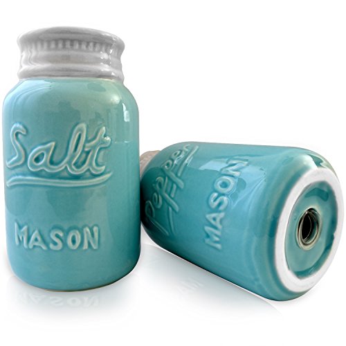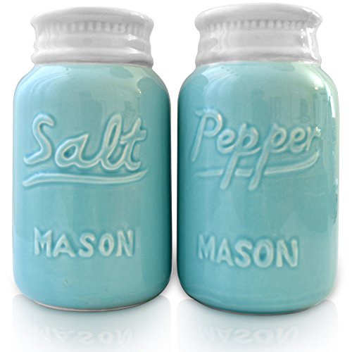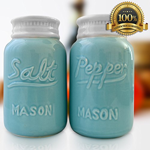 Vintage Style, Ceramic Salt and Pepper Shakers (Large 8 oz), Mason Jar Inspired - Set of 2, Premium, Super Cute, Retro, Decorative, Durable and Functional by My Fancy Farmhouse (Blue)