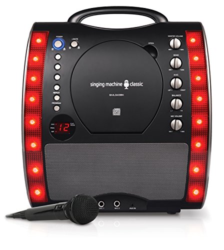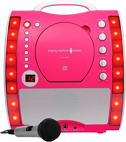 SML343 Karaoke System Pink. Karaoke is here to stay. The Singing Machine Classic series blows the roof off your mother's karaoke, pumping your favorite music out of a lightweight package. The SML343 features a front loading CD Player that plays music CDs and CD+Graphics. The disco light feature kicks up your performance with extra glam. Line-in lets you connect to other audio devices (sold separately). RCA output jacks connect to your TV to scroll the lyrics, and the two microphone jacks allow you to sing a duet without sharing a microphone (one microphone included). The built-in speaker provides powerful sound.Feature