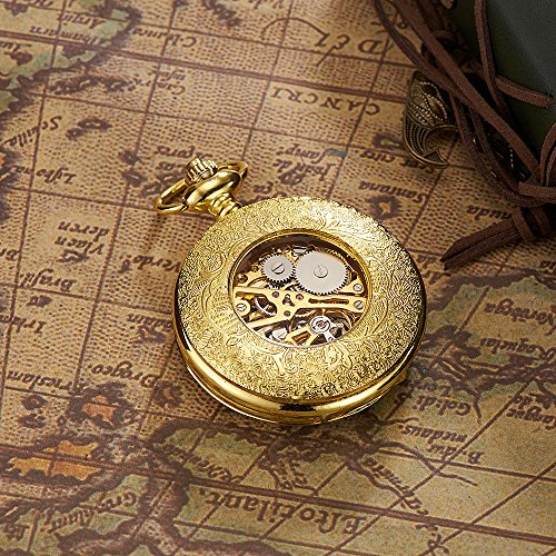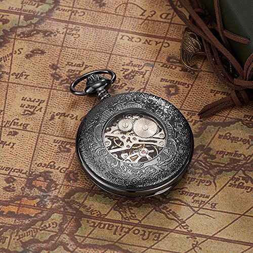 -. Feature : Old fashioned fob watch for style and time keeping purposes; / rudder shaped skeleton watch case; / luminous pointers; / mechanical movement inside; / see-through case back with delicate carving.