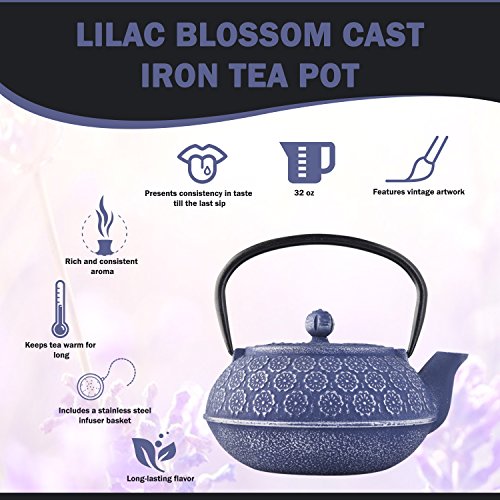 Tea was first discovered by Emperor Shen Nung in Ancient China in the year 2732 BC when a wild leaf fell into his pot of boiling water and he suddenly found himself falling in love with the rich aroma, so much so that he had to take a sip. The art of tea making was slowly refined and richer and more flavorful tea leaves began to find their way into society. It was around this time that the importance of having the right tea pot was also discovered. In fact, choosing a high-quality teapot is as important as having the right tea leaves! A cast iron tea pot is the kettle of choice among tea aficionados because it can last for a lifetime, without diminishing the flavor or developing leaks. In fact, over time, many kettles begin to retain some of the flavor of the brew, adding to the aromas and tastes. This is one of the main reasons people tend to choose different teapots for different leaves. Featuring rich designs and artworks inspired by ancient masters, this cast iron teapot offers intense aromas and a burst of flavor in each sip, maintaining a high temperature for a long period of time. This cast iron teapot with infuser isn't just for everyday use, it is a symbol of future satisfaction, appreciation and joy. Features - Made of cast iron - Intense aroma and flavor in every sip - Maintains high temperature for a long period of time - Easy to clean and maintain - Stainless steel infuser basket - 32oz