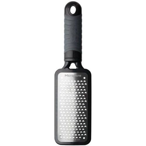 Studio : Microplane Publisher : Microplane Binding : Kitchen Product Description Grate all of the coarse ingredients you need for dinner with the Microplane Home Series black coarse grater with a one year manufacturer's warranty. This is the perfect grater for grating hard and soft cheese, butter, cabbage and potatoes. The cutters are 0