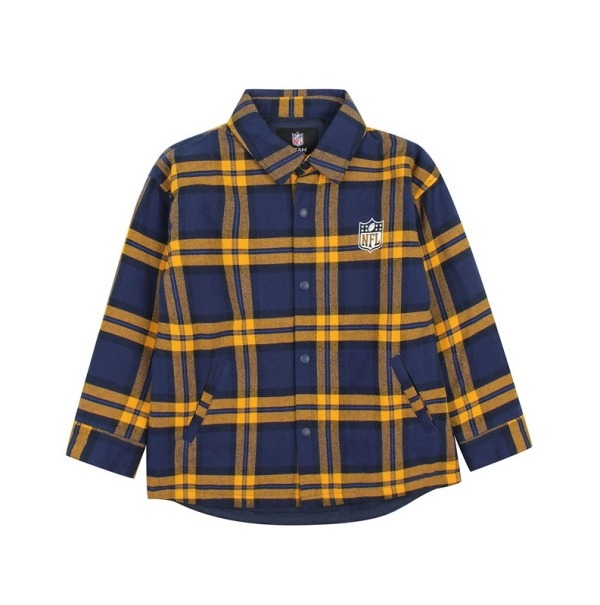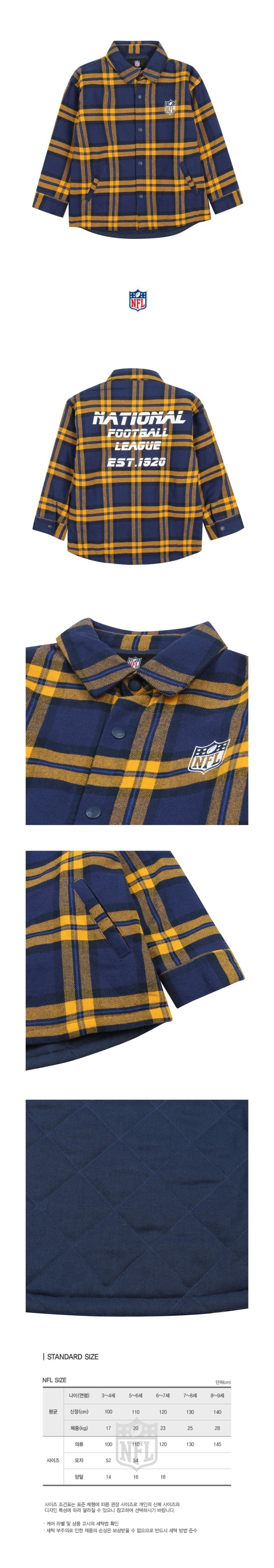 기모감이 있는 체크로 약패딩이 들어간 박시 핏의 셔츠입니다.앞판의 NFL엠블럼 나염과 뒷판의 레터링 나염이 포인트인 아이템입니다.