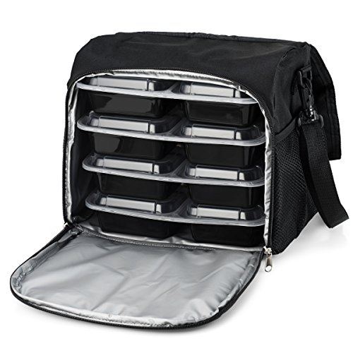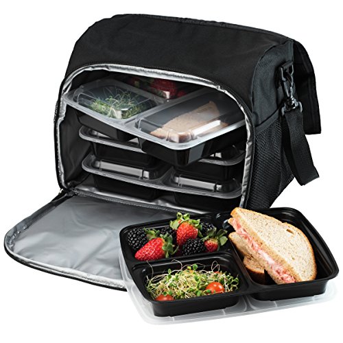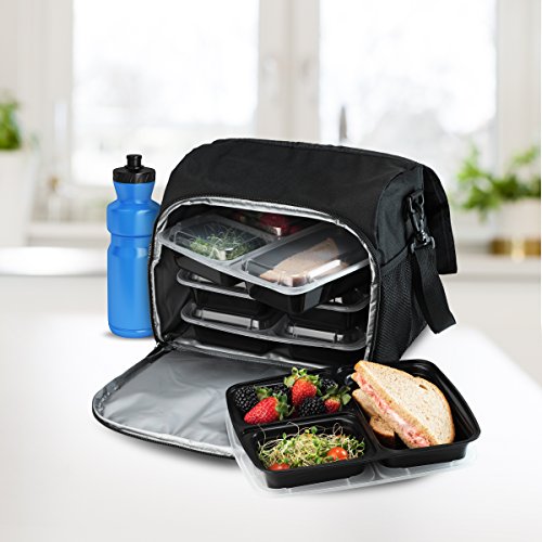 FamGo Meal Prep Lunch Bag-Lunch Boxes Insulated Cooler Kit, Zipper & Buckle Closure, Matching Colored 3 Compartment Bento Lunch and Food Storage Container with Airtight Lid, 15 Piece - Black
