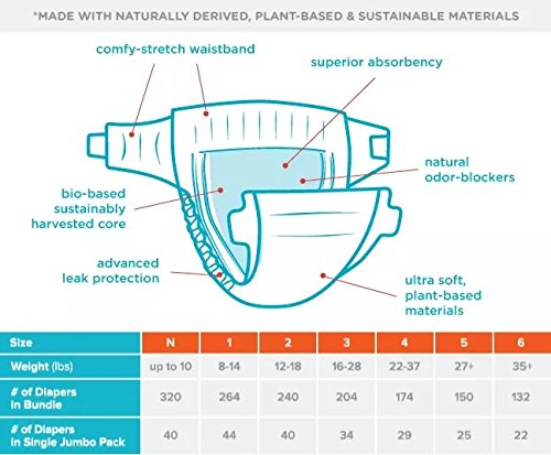 -. Feature : PLANT-BASED (PLA) inner and outer layers - gentle on your baby's bottom / GENTLE and pure - no fragrances, lotions, or latex / COMFY-STRETCH side panels and soft, refastenable tabs for perfect fit and wigglability! / SECURELY fitting moisture barrier cuffs help prevent leakage and blowouts / GENTLE, safe, and non-irritating for sensitive skin