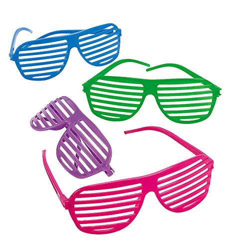 -. Binding : Apparel -. Brand : Funny Party Hats -. ClothingSize : One Size -. Color : Blue Green -. Department : mens -. Feature : Assorted colors of purple, blue, pink and green. / Fun for adults and children alike! Mesures, 6" x 2 1/4" with 5 1/4" ear pieces. / See the world in a new way with these plastic novelty shutter shade glasses! / Makes a great party favors or goody bag P.R.Izes for your Hawaiian luau or summer beach party. / Have a blast from the past at your next summer party. -. Model : am769 -. PackageQuantity : 12 -. ProductGroup : Apparel -. ProductTypeName : ACCESSORY -. Size : One Size -. Title : 12 Pairs of 80's Sunglasses - Set Of Dozen Cool Plastic Shutter Shading Glasses -. UPC : 632181241295