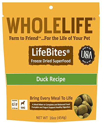 -. Binding : Misc. -. Brand : Whole Life Pet Products -. EAN : 0895777000274 -. Feature : Whole Muscle Protein with no ground bone creates amazing taste and texture / Human Grade mixer or complete meal made in-house in small fresh batches daily / Live active probiotic cultures from yogurt plus pumpkin to support healthy digestion / Rich in Antioxidants from raw fruits and vegetables and Omega's from Chia and Flaxseed / Every batch tested and verified safe -. Label : Whole Life Pet Products -. Manufacturer : Whole Life Pet Products -. Model : FD274 -. MPN : FD274 -. NumberOfItems : 1 -. PackageQuantity : 1 -. PartNumber : FD274 -. ProductGroup : Boost -. ProductTypeName : PET_SUPPLIES -. Publisher : Whole Life Pet Products -. Size : 16 oz -. Studio : Whole Life Pet Products -. Title : Whole Life Pet LifeBites Duck Recipe Freeze Dried Food for Dogs, 16 oz -. UPC : 895777000274
