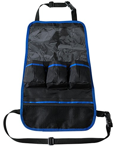 -. Feature : Protective, extra-large plastic top pocket holds iPad and Android Tablets up to 10 inches. / The storage organizer fits most cars, SUVS, and trucks, and can even fit over large strollers. / Five roomy pockets hold sippy cups, bottles, toys, snacks, wipes, coloring items, books, and more. / Made of durable, washable, polyester in an attractive gray with blue trim. Can be wiped clean. / Easy to install with a top strap and a four-foot bottom strap to secure to even oversized car seats.