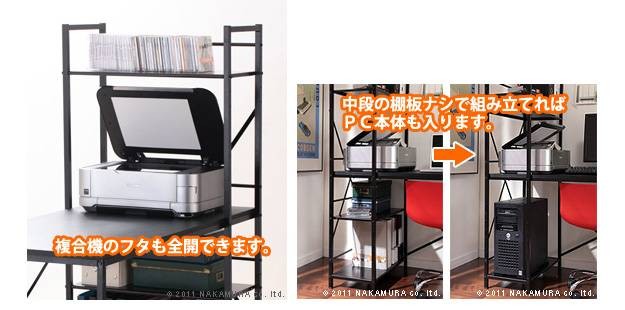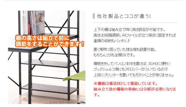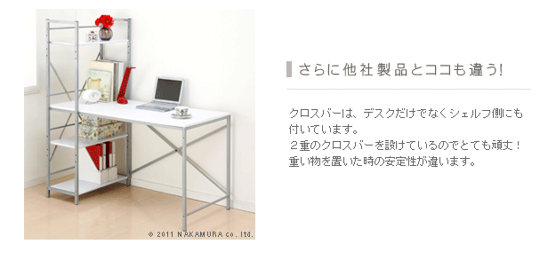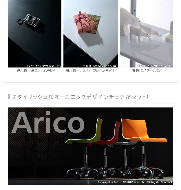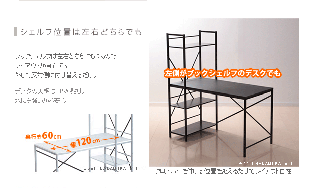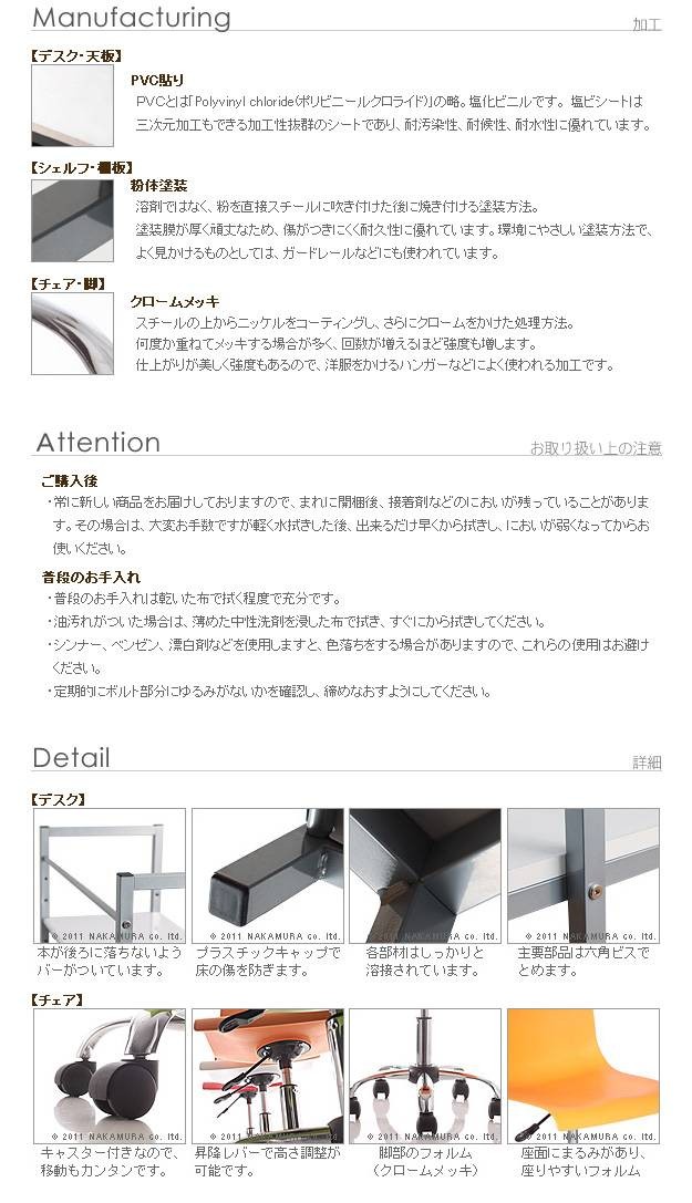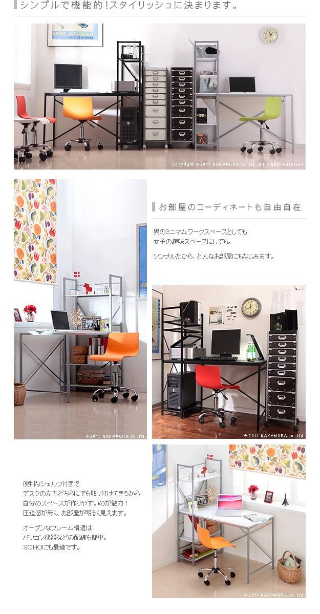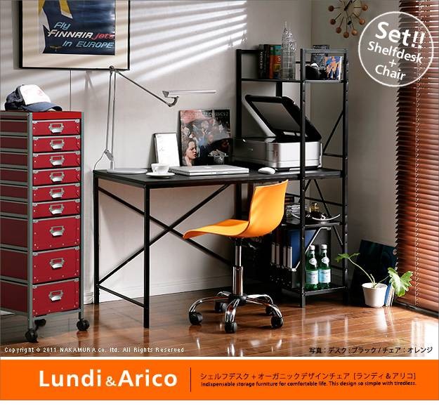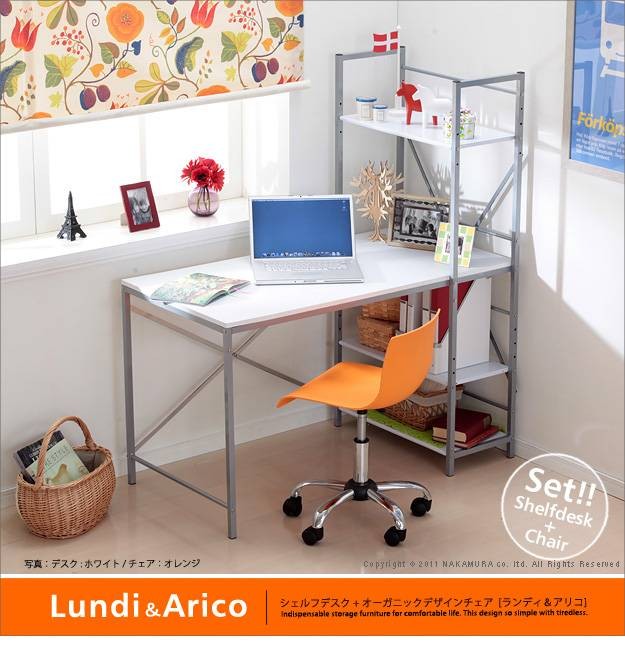 商品について:シンプルで機能的なシェルフ付きデスクとデザインチェアのセット。シェルフは左右どちらでも設置可能。チェアはキャスター付、昇降タイプです。
