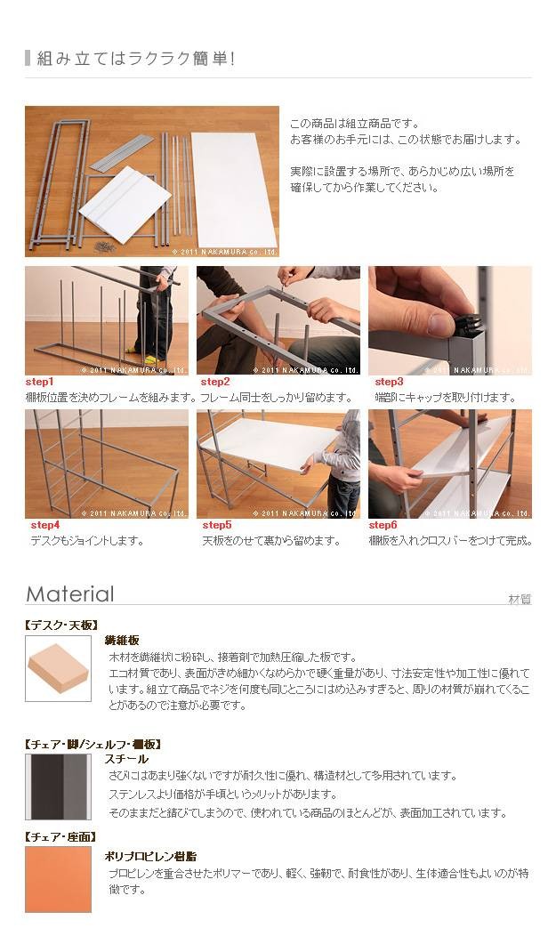材質:デスク本体・チェア脚部-スチール、天板-中質繊維板(PVC貼り)、座面-ポリプロピレン樹脂