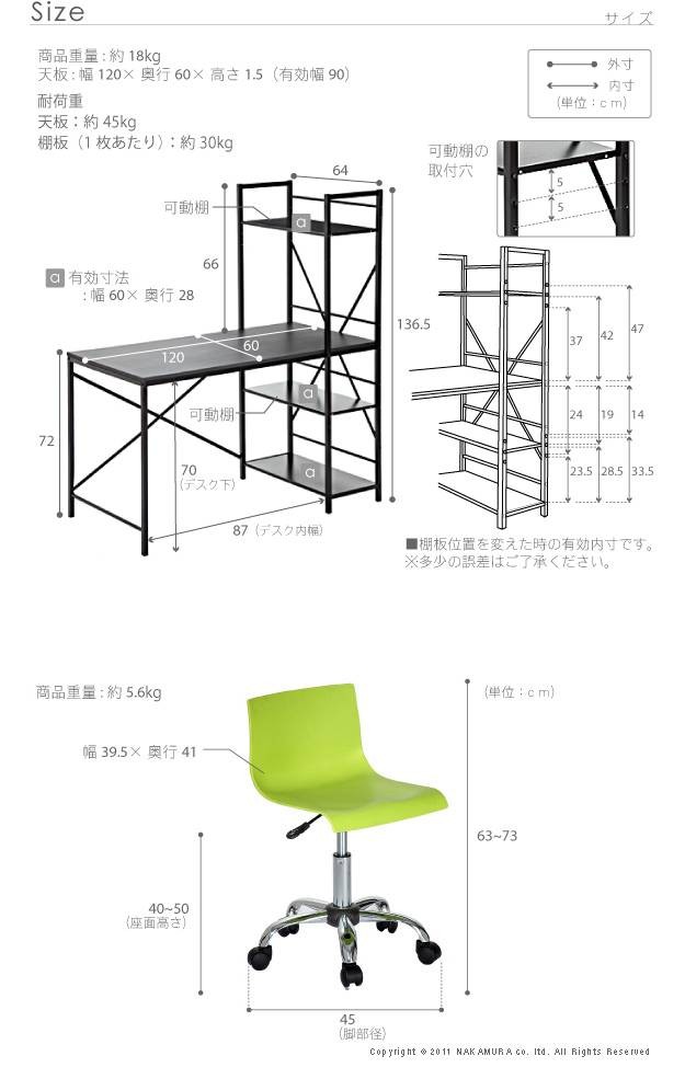 サイズ(cm):デスク-幅120x奥行64x高さ136.5(デスク有効サイズ幅90x奥行60、デスク下70)・約18kg、チェア-幅45x奥行45x高さ63~73(座面幅39.5x奥行41・高さ40~50)・約5.6kg