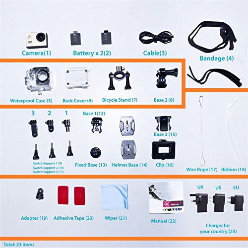 Pakage Includes:2PCS Rechargeable Battery (900mAh)!!!!!! SJ4000 1080P Sport Camera, Waterproof Case, Bicycle stand, Base 1, Base 2, Clip, Fixed base, Switch support 1, Switch support 2, Support 3, Adapter, Helmet base, Bandage, Ribbon, 3M tape, Wire rope, Date wire, Manual, Wiper, Standard US AC charger