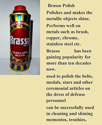 -. Feature : Brasso - India's leading Copper Brass Cleaner Cum Shiner Liquid Used For shining mettalic objects like Copper ,Brass ,Stainless Steel Chrome instantly with no extra efforts. Net weight:90ml / 3 packs of Brasso Polish 90ml =3x90ml=270ml / Famous brand made in india / is used to polish and make the metallic objects shine. Brasso polish performs well on metals such as brash, copper, chrome, stainless steel etc.