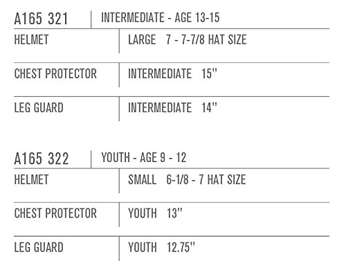 Product Description Serious Catchers Kit for the aspiring Backstop. Conveniently packaged Helmet, Chest Protector and Leg Guards, designed to improve a Catcher's Pop Time while providing superior protection and a stable platform when blocking the plate. 0