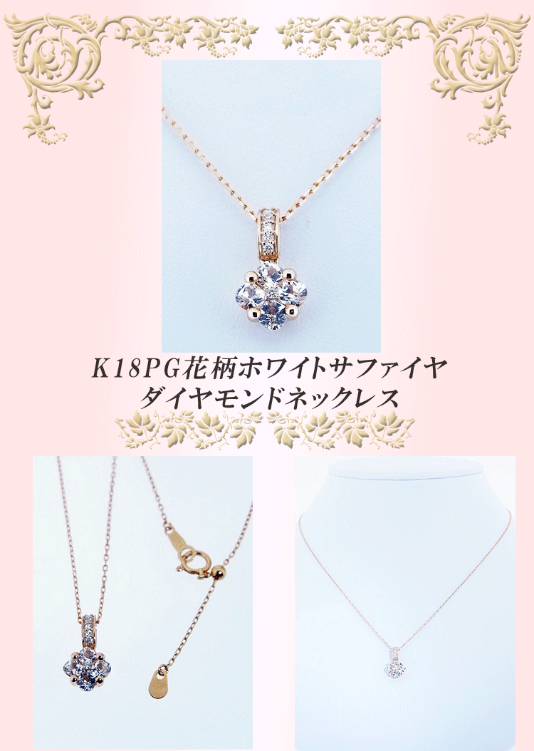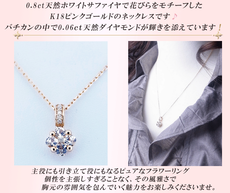 0.8c天然ホワイトサファイヤで花びらをモチーフしたK18ピンクゴールドのネックレスです。0.06ct天然ダイヤモンドがバチカンの中で輝きを添えています。