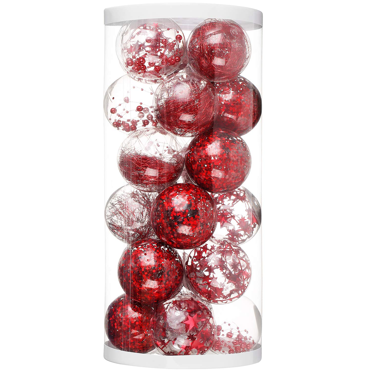 【パッケージ内容】ボール装飾品24個セット 【本体サイズと素材】(約):直径8cm 素材:プラスチック 【カラーと図柄】4柄×各6個 (ひも付き)カラー:透明ボール,ボール内部にレッド飾り 【商品の梱包】配送により破损を防ぐため、改善した包装は以前より10倍の厚さでもっと丈夫で輸送トラブルを减らできます。また缲り返し利用もできます。外侧の包装に「Open Here」と字で目立つように书かれていた。 【聖なる夜を楽しむ】高級感のある透明タイプ、より一層華やかにしてくれるオーナメントボールです!。好きな色を組みあわせて、可愛らしいデザインが楽しい雰囲気を演出し、クリスマスを一層華やかにします。