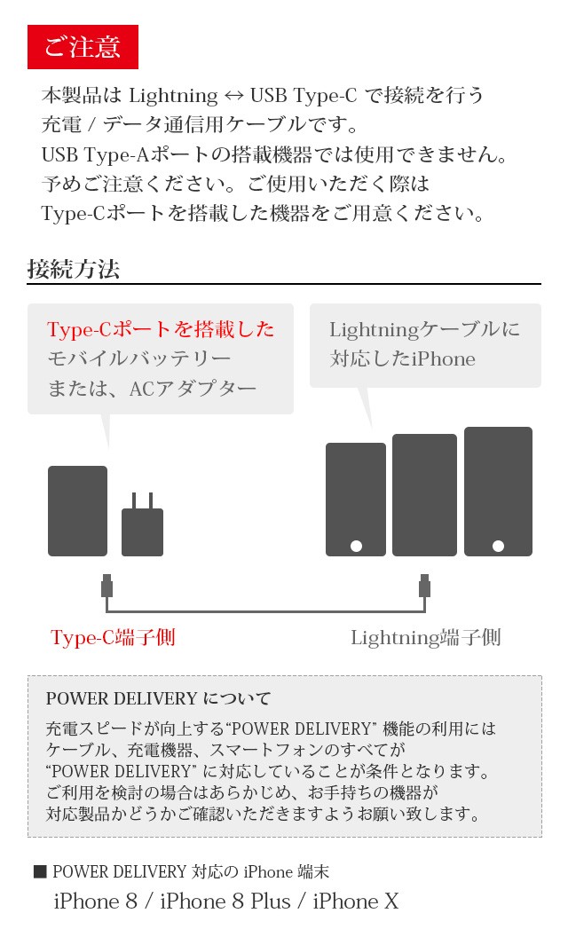 | Type-C to Lightning ケーブル 長さ:1.2m 重さ:20g 素材:ナイロン・TPE | |