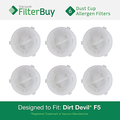 [Product Information]- 6 - Dirt Devil F5 Dust Cup Replacement Filters. High Quality washable & reusable dust cup filters designed to fit Dirt Devil Scorpion Hand Vac models 08200, 08201X, 08210, 08215X, 08220X, 08225X, 08226X, 0871, 0871X & SD20005RED.