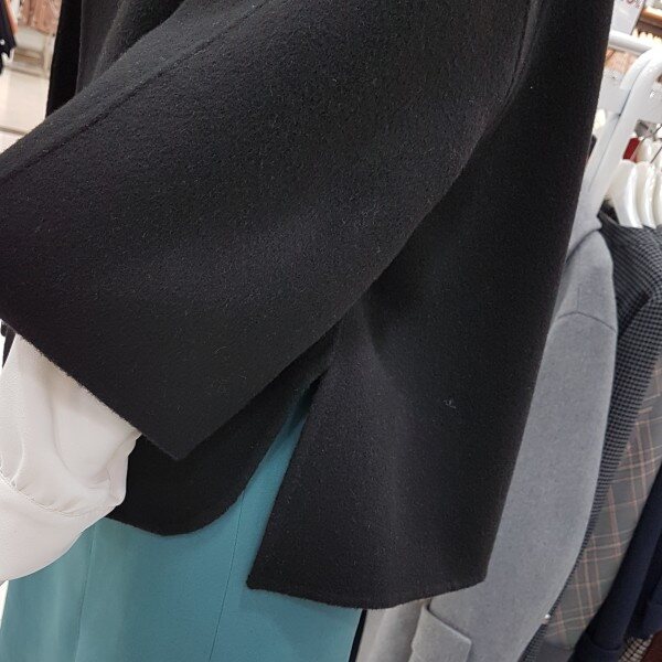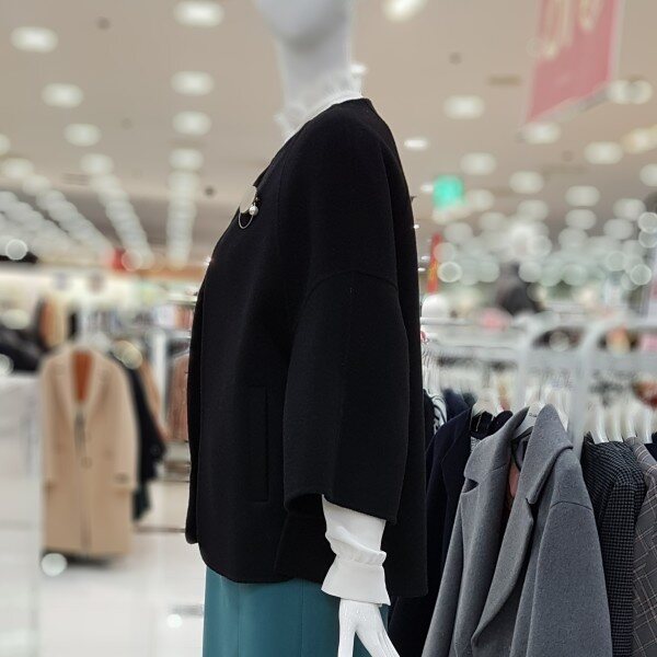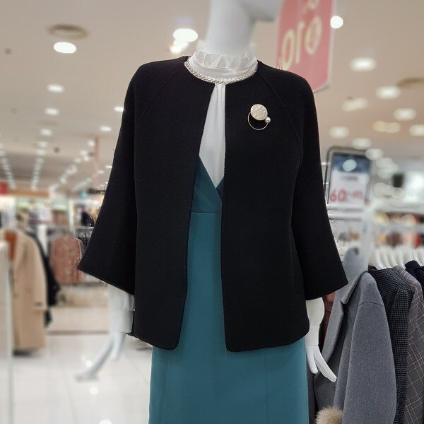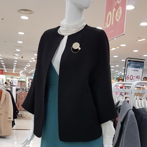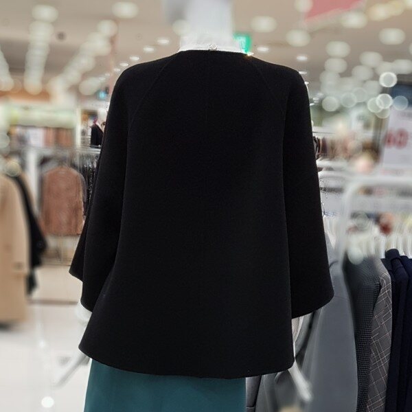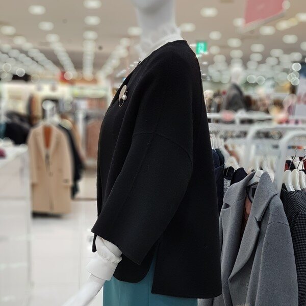 모100%에 가볍고 포근한 아이네요어깨선없이 ?~떨어지는 핏에A라인 소매는 상체통통 제가 날씬해보이구요 엉덩이 살짝 덮히는 기장에 넘 좋으네요라운드넥에 센스있는 브로치가 여성스럽네요