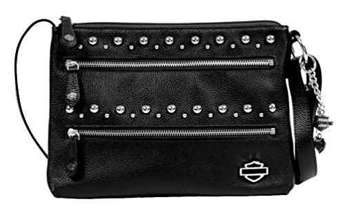 -. Brand : Harley-Davidson -. ClothingSize : 10.25" x 7.25" x 1.25" -. Color : Black -. Department : womens -. Feature : Harley-Davidson Women's Crossbody Purse / Made of black peddled top grain leather / Features shiny-nickel open Bar & Shield medallion, dome studs and our signature hang charms / Interior features purple dagger lining / Size: 10.25" L x 7.25" H x 1.25" D -. Label : MTMB Inc -. Manufacturer : MTMB Inc -. Model : RD6514L-BLACK -. MPN : RD6514L-BLACK -. PackageQuantity : 1 -. PartNumber : RD6514L-BLACK -. ProductGroup : Apparel -. ProductTypeName : APPAREL -. Publisher : MTMB Inc -. Size : 10.25" x 7.25" x 1.25" -. Studio : MTMB Inc -. Title : Harley-Davidson Women's Bar & Shield Studded Crossbody Purse, Black RD6514L Harley-Davidson® Women's Studded Bar & Shield Crossbody Purse, RD6514L-BLACK. Made of black pebbled top grain leather. Shiny-Nickel open Bar & Shield medallion, dome studs and signature hanging charms. Features top zip and two front zippered pockets. Interior features purple dagger lining. Size: 10.25" L x 7.25" H x 1.25" D.