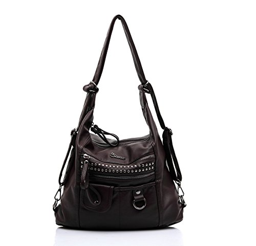 -. Brand : Siena Collections -. Department : womens -. Feature : Stylish and elegant bag with beautiful gunmetal color hardware and decorative studs between horizontal zippers. Asymmetrical front flap over pocket design makes this bag never out of style! Easy conversion between single shoulder bag, cross-body bag and backpack. Made of of high quality leatherette which resembles the texture and softness of lambskin. / Fabric-lined spacious interior with two roomy main compartments . One with interior zippered pocket and the other with cell phone and sunglasses pockets. Two front zipper pockets for large size smart phone and other items with easy access. Two small front pockets with slap over and magnetic snap closures. Large exterior back pocket for easy access. / Shoulder strap can be easily extended from a shoulder bag to a cross-body bag and backpack. Extendabe from drop size of 11" (on shoulder) to 22" (cross body) to backpack use (fully extended) / Approximate Dimensions: 14" W X 12" H X 5" D (Interior capacity: medium) -. Model : SC010 -. PackageQuantity : 1 -. ProductGroup : Shoes -. ProductTypeName : HANDBAG -. Size : Large -. Title : Siena Signature Shoulder Crossbody Backpack Everyday Bag SC010
