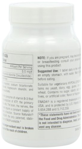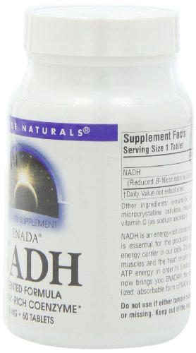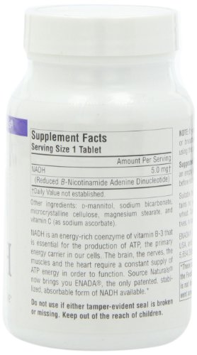ReleaseDate : 2006-06-21 Studio : Source Naturals Publisher : Source Naturals Binding : Health and Beauty Product Description Dietary supplement. Patented formula, energy - Rich Coenzyme. Vital for cellular energy. NADH is an energy - rich coenzyme of vitamin B-3 that is essential for the production of ATP, the primary energy carrier in our cells. The brain, the nerves, the muscles and the heart require a constant supply of ATP energy in order to function. Source Naturals now brings you ENADA, the only patented, stabilized, absorbable form of NADH available. Suitable for vegetarians. Contains no yeast, dairy, egg, gluten, soy or wheat. Contains no starch, preservatives or artificial color, flavor or fragrance. (These statements have not been evaluated by the Food and Drug Administration. This product is not intended to diagnose, treat, cure or prevent any disease.) 0