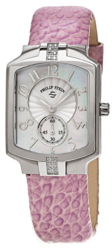 -. Feature : The Philip Stein Natural Frequency Technology is delivered to wearers through a metal disk that has been infused with key frequencies in a proP.R.Ietary process. When worn on the wrist, the watch exposes frequencies to the biofield - which is the master energy field that regulates the body's functions - and informs the body to relax and become more resistant to stress. Studies have shown, better sleep, less stress, clearer focus and better concentration, for wearers of Philip Stein watches / Brushed stainless steel case (28 mm x 39 mm, 10 mm thick), Screw-in case-back with sapphire crystal window revealing the Natural Frequency Technology chip, Polished stainless steel bezel set with 16 diamonds / Mother of pearl dial with silver sunray center, Silver-tone luminescent hands, Silver-tone Arabic numerals, Small seconds sub-dial at the 6 o'clock position / Sapphire-coated mineral crystal, Swiss quartz movement, Water resistant to 3 ATM/30 meters/99 feet / Grainy lavender calfskin leather strap, Pin buckle