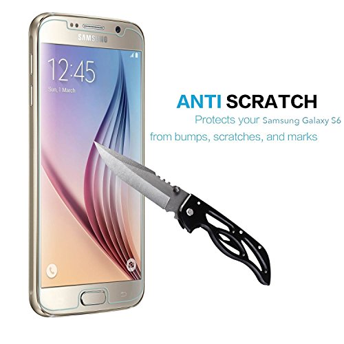 -. Feature : 0.26mm tempered glass screen protector designed for Samsung Galaxy S6 ONLY, perfect cut and fit for your phone's screen, 2.5D round edge provides more comfortable handle feeling than the right angle edge, and will never hurt your fingers / One-push super easily installation: Precise laser cut tempered glass made with polished, rounded edges, automatically attach to the screen smoothly, hassle-free and bubble-free. No residue when removed, can repeatable installation / Featuring maximum protection: 99.99% HD Clarity and Touchscreen Accuracy, Oleophobic screen coating magically resists oils and reduces annoying fingerP.R.Ints, against dirt and dust. Explosion-proof 9H Hardness Scratch-resistant screen protector can effectively protect your Samsung Galaxy S6 from unwanted scuffs and scratches by knife, keys and some other hard substances / Lifetime no-hassle warranty provides easy lifetime protection for your tempered glass screen protector / Online video tutorials and detailed Instructions on how to correctly install your screen protector