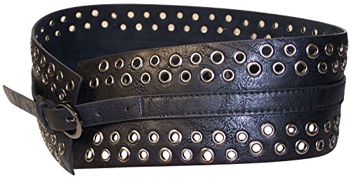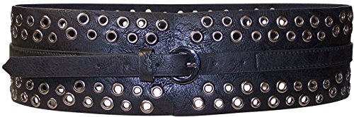 This belt is pure rock-chic style! This wide women's belt is made of soft faux leather embellished with dark metal eyelets. A skinny belt strap is sewn in the middle with six holes for width adjustment: fits sizes 29 - 35 inches / 74 - 90 cm. This ultra-stylish waist belt is an absolute eye-catcher with its attractive, sexy design. - Shipping takes 3-6 days in Europe and generally not more than 8-10 days to non-European countries.