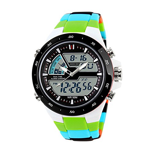 -. Feature : 164FT waterproof: 164 FT (50 M) waterproof - 5ATM water resistant. NOTE: DO NOT press any button under water. / Dual dial two timezone: analog and digital dual dial are designed to support two different timezones. Original Japanese quartz movement used to provide precise and accurate time keeping. / Durable: It is made of shock resistant material and uses long-last battery. Button, buckle and rear cover are all made of stainless steel. Highly transparent resin window makes the watch pressure-proof. / Comfort with fashion: Germany-made PU watch band makes it comfortable to wear and lead you to edge sport fashion. Perfect for both indoor and outdoor activities. / Multi-functional: dual timezone, 12H/24H format, stop watch, calendar day and date, alarm, LED display and back light, make it perfect for all kind of sport and daily use.
