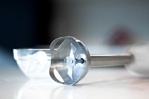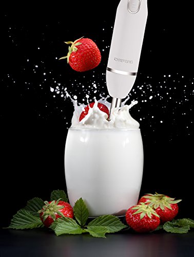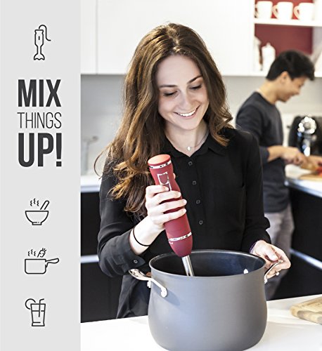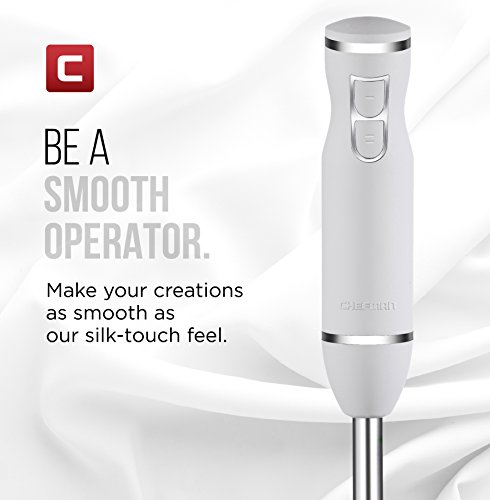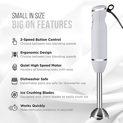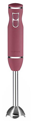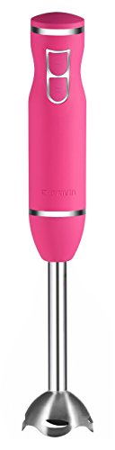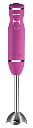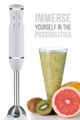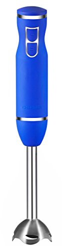 Equipped with a powerful 300-Watt ultra quiet motor, this immersion hand blender quickly purees soups, blends batters, mixes beverages, and more. The unit's unique blade provides extremely smooth and even blending, while its protective blade guard helps prevent splattering. Other useful features include a lightweight design, an easy to-grip ergonomic handle, and simple push-button control.