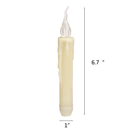 Specifications: Size: 1'D*6.7'H, standard size can fit in most taper candle holder. Material: Plastic, high quality material guarantee. Light color: yellow, create a comfortable and warm Surface color: Dark green Battery: 2 AA batteries required (included and installed). Battery life: 70 hours. Quantity: pack of 6 taper candles per pack