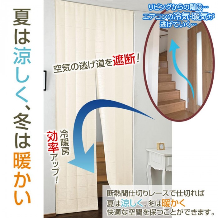| 断熱・遮熱の特殊ポリエステル糸を使用した間仕切りレースカーテン。夏の暑さを軽減し、冬は断熱。防汚加工で汚れがつきにくく落ちやすい。繊維産地福井県産のエレガントなリーフ柄のレース。ほつれないカットラインがついているのでサイズ調整OK。省エネ/エコ/断熱/保温/すきま風/のれん/間仕切り/レース/カーテン/夏/冬/暑い/寒い |