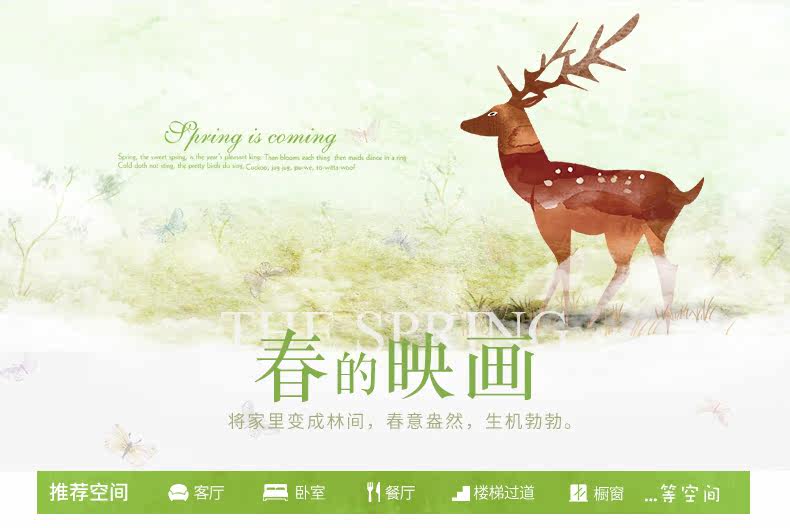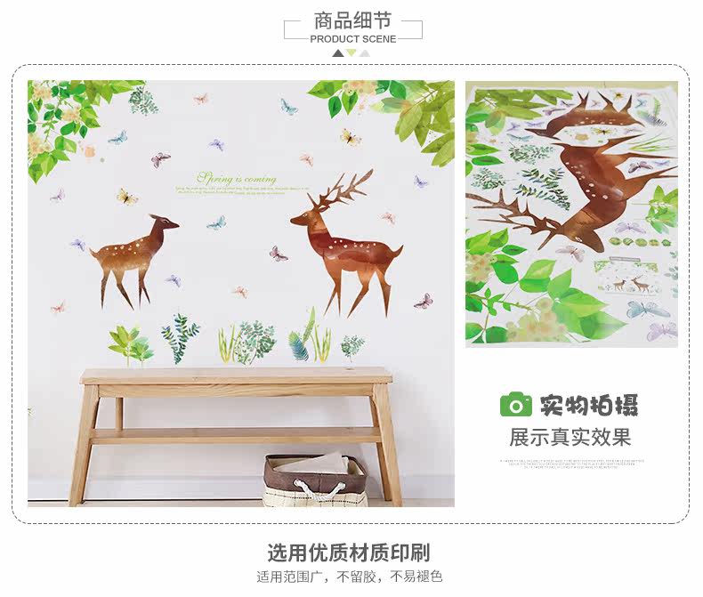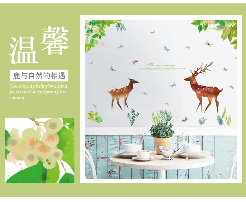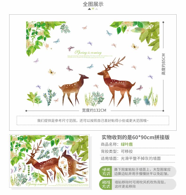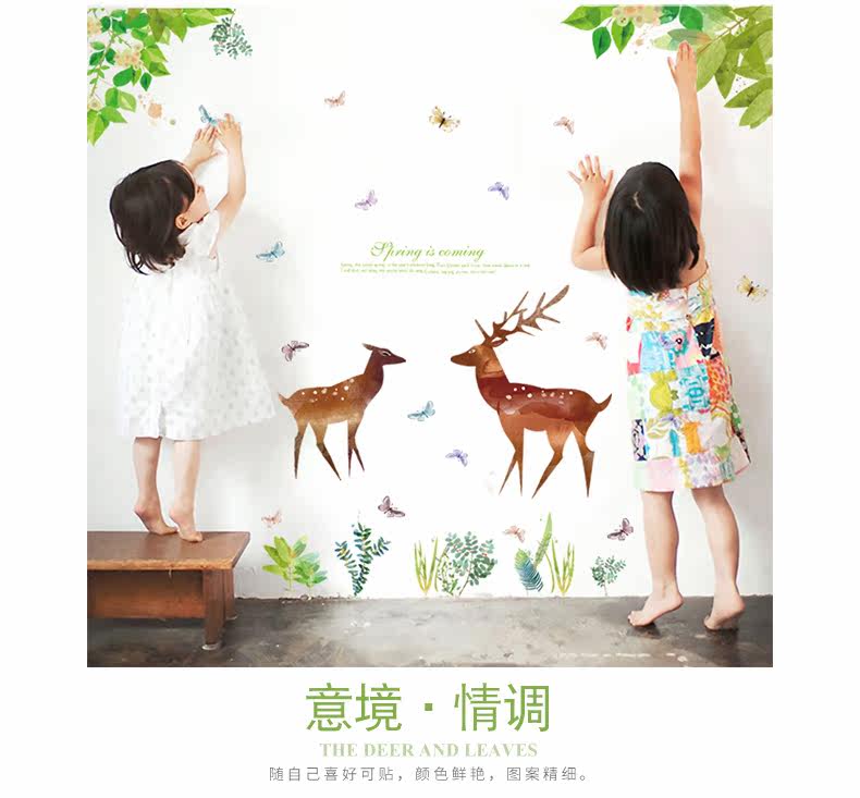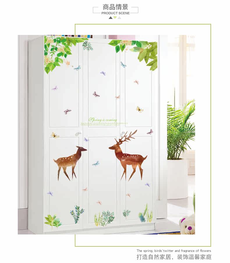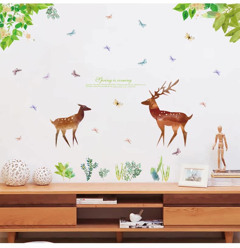 卡通动漫麋鹿绿色小清新客厅卧室橱柜背景装饰可移除墙贴纸贴画