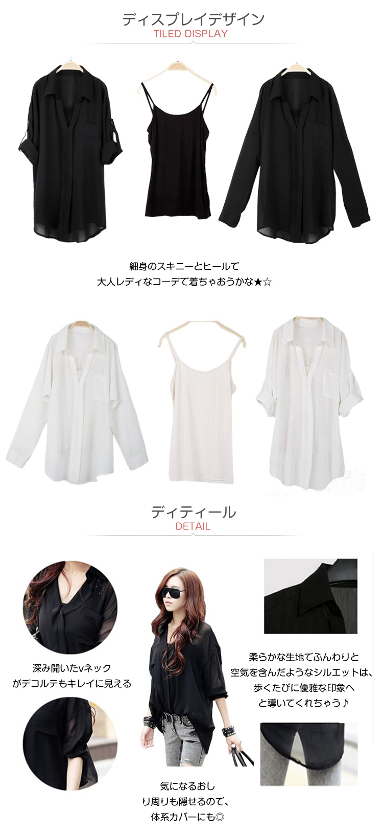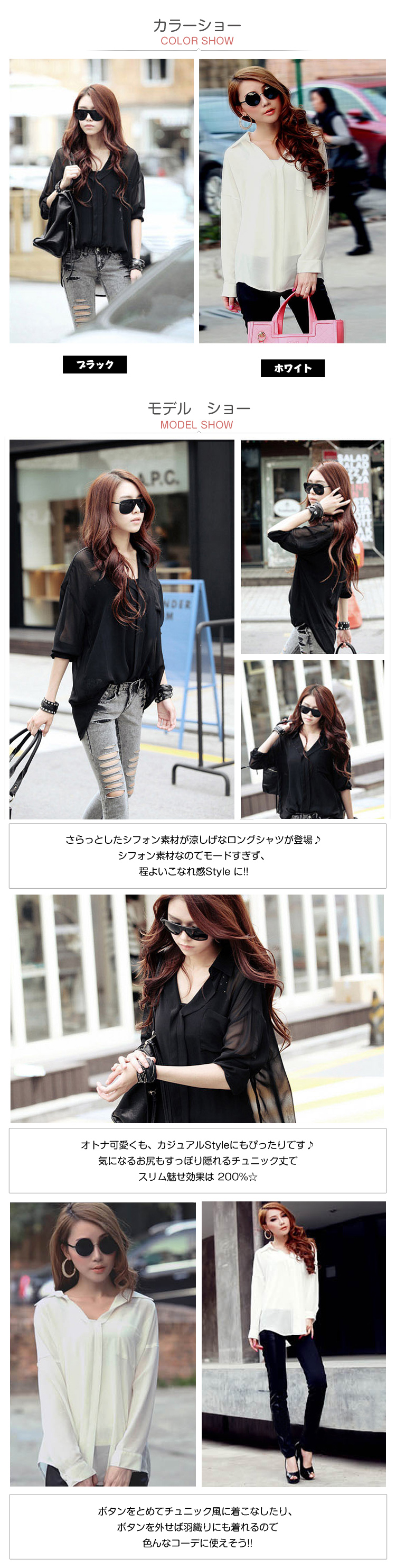 | さらっとしたシフォン素材が涼しげなロングシャツが登場?シフォン素材なのでモードすぎず、程よいこなれ感Style に!!オトナ可愛くも、カジュアルStyleにもぴったりです?気になるお尻もすっぽり隠れるチュニック丈でスリム魅せ効果は 200%☆ボタンをとめてチュニック風に着こなしたり、ボタンを外せば羽織りにも着れるので色んなコーデに使えそう!!細身のスキニーとヒールで大人レディなコーデで着ちゃおうかな★☆ | |