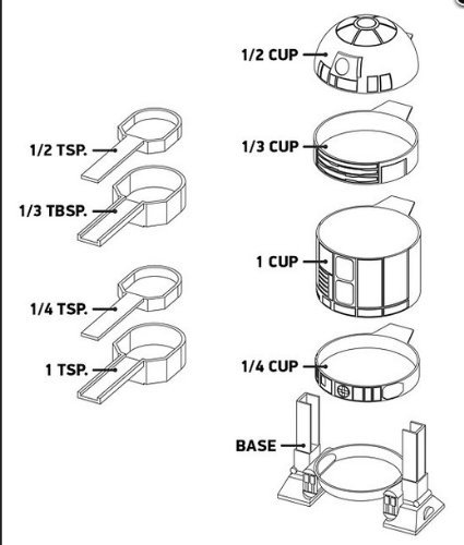 -. Feature : Set of measuring cups that look like R2-D2 / Officially-licensed Lucasfilm merchandise / Body built from 4 measuring cups: 1/4, 1/3, 1/2, and 1 cup / Detachable utility arms turn into nested measuring spoons: 1/4, 1/2, 1 tsp, and 1/3 tbsp / Dome is both 1/2 cup and 1 tbsp