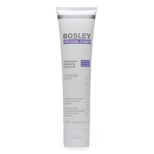 -. Feature : Bosley®, the most recognized hair restoration brand in the world, has created Professional Strength for thicker fuller hair / Volumizing & Thickening Weightless Styling Gel creates thicker, fuller-looking hair. LifeXtend complex with natural-derived Volumizers help create body & strength. / Pentapeptides promote healthy hair growth & Apple Stem Cell Extract may support healthy hair function. / Humidity & heat-resistant, alcohol-free & thermal-styling protective. Imparts shine, no flaking.