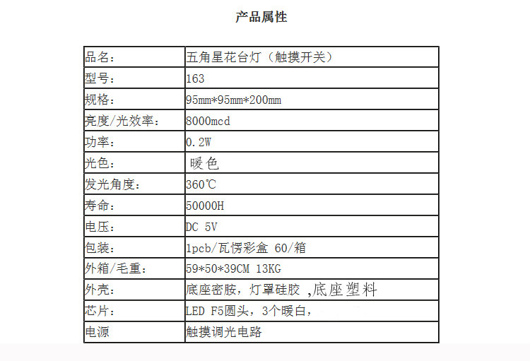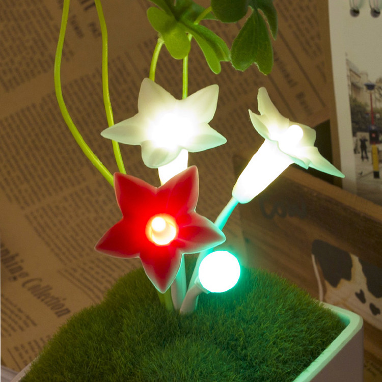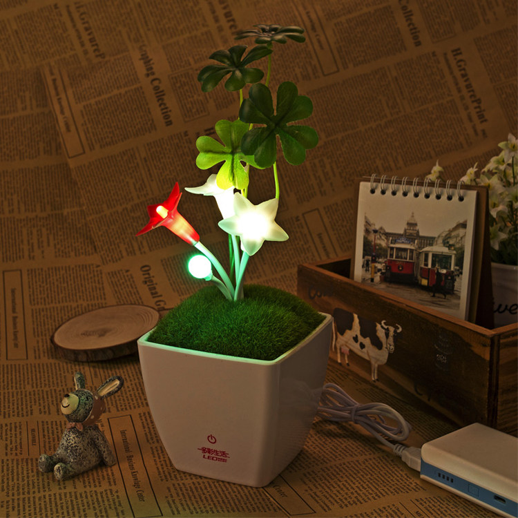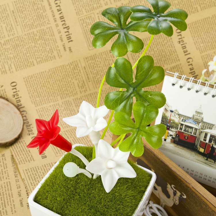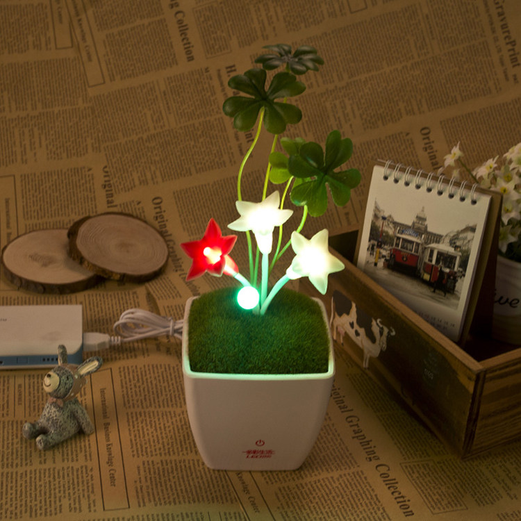 本产品为创意型桌面小台灯。产品新颖美观,大气高档,五角星花与花蕾采用软性硅胶制品,拉捏都不变形,花茎采用吸塑管制作,内含铁丝,可随意摆出您喜欢的定造型,幸运草采用布艺丝花高仿真,看起来像真的幸运草。超逼真植绒草皮,仿瓷密胺底座,触摸调光开关,USB 直流供电,造就了一个完美的产品。本品适合摆放于办公桌面,作为盆栽小台灯,摆放于书柜,作为摆件,摆放于床头柜,作为床头小夜灯。触摸可开关及调光,方便实用,5V直流电压,安全节能,产品看起来像真盆栽,但是不可以浇水哦,晚上开起灯光效果非常好,可爱迷人,可作为礼品,为你的亲朋好友送上最最温暖的祝福。