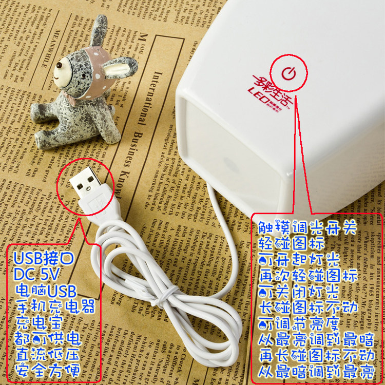 产品开关采用IC触摸型开关,用手触摸开关图标,产品即可亮起灯光,再轻触一次即可关闭,如果觉得光线太亮了,想调暗,只需把手指停留在开关图标上,这时产品由高亮度慢慢降到低亮度,觉得亮度可以了就放手,这时亮度就定格在您想要的亮度,IC有记忆功能,您下次再开起的时候也是您定格的亮度哦,如果您想调亮,只需再次轻摸开关图案不放手,亮度就会由暗变亮,到您想要的亮度放手就可以了。无限次调光,由暗到亮,由亮到暗,随您怎么玩。