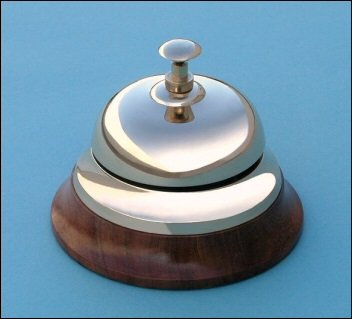 -. Feature : This beautiful bell is a faithful antique reproduction of a desk bell found in fine hotels in the late 1800s. / The bell is solid brass with a nickel plating, mounted on a solid seasoned hardwood turned base. / The bell has a large ringing plunger on top and produces a loud and clear tone. / The desk bell is large, measuring 4 1/2 inches (11.4 cm) in diameter, 3 1/2 inches (8.9 cm) tall, and weighing 15.5 ounces (440 grams).