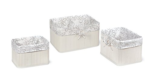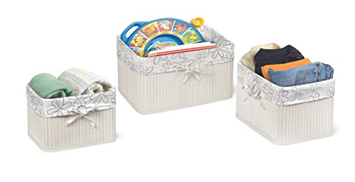 ReleaseDate : 2017-02-06 Studio : Badger Basket Publisher : Badger Basket Binding : Baby Product Product Description Badger Basket's Claremont Three Basket Set includes three handy baskets for your nursery, closet, bathroom, bedroom, or anywhere in the house! Stylish construction attractively contains baby supplies, toys, crafts, and more. Three sizes help your child learn sort their things by size and clean up. Each basket includes a removable, washable fabric liner. The baskets ship flat and quickly assemble without needing tools. These sturdy, rigid baskets also make nice containers for holiday and special occasion gift baskets. Baskets nest inside each other for storage. Coordinates with Badger Basket's Claremont Rectangle Hamper (sold separately). Basket bodies are wood with PVC trim. Inside support hoops are steel metal wire. Basket bodies have 100% Cotton string on bottom and 100% polyester thread. Bottom panel covered in non-woven fabric. Fabric liner is 100% Polyester. Large basket measures: 14.5 inches W x 10 inches D x 8 inches H. Medium basket measures: 12 inches W x 8.5 inches D x 7.5 inches H. Small basket measures: 9.75 inches W x 7.5 deep x 6.5 inches H. Assembled product weight: 3.6 pounds (whole set), 1.4 pounds (large basket), 1.2 pounds (medium basket), and 1.0 pound (small basket). All measurements approximate. Spot clean basket bodies and bottom panel as needed with a lightly dampened cloth and mild detergent and air dry. Fabric liners can be machine washed in cold water, tumble dry low or air dry. Adult assembly required. No tools needed for assembly. Illustrated instructions included. Product includes a limited warranty of 30 Days Parts to the original purchaser. Product details/features subject to change at any time without notice. Props/accessories shown are for illustration purposes only and are not included with the product. Actual color/finish may vary slightly from screen display. This item ships in its original carton which may include a product photo. 0