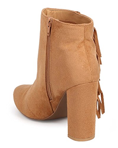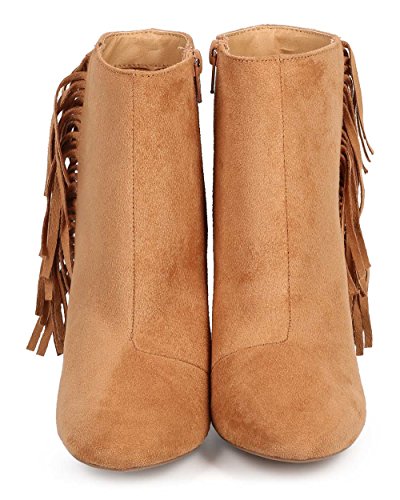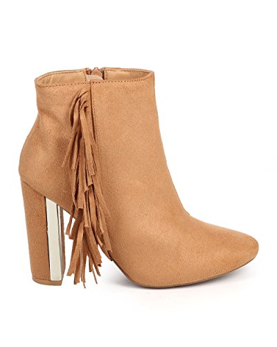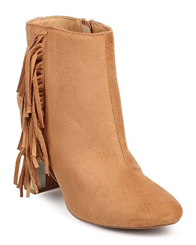 Qupid DG31 Women Suede Almond Toe Vertical Fringe Metallic Block Heel Bootie - Toffee