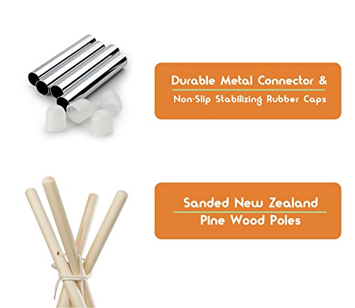 NOTHING BUT THE HIGHEST IN QUALITY FOR YOUR CHILDREN Our canvas teepee tent for kids was crafted with a lot of love and thought put into giving your kids a high quality product. The fabric is a cotton canvas with stitched flooring. The poles are derived from a New Zealand pine wood which has been sanded to a beautiful, smooth finish. The teepee tent for kids with floor utilizes metal connectors to ensure durability and rubber caps at the ends to eliminate pole slippage and stability.