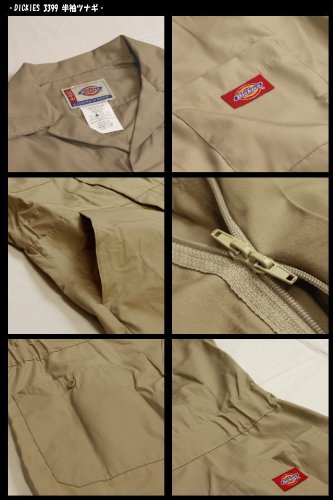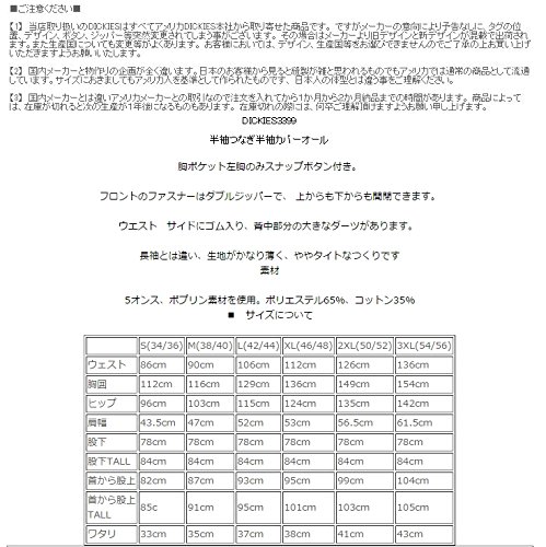 -. Feature : DICKIES 3399 半袖つなぎ 胸ポケット左胸のみスナップボタン付き。 フロントのファスナーはダブルジッパーで、 上からも下からも開閉できます。 ウエスト サイドにゴム入り、背中部分の大きなダーツがあります。 長袖とは違い、生地がかなり薄く、ややタイトなつくりです 素材 5オンス、ポプリン素材を使用。ポリエステル65%、コットン35% / • Sサイズ ウエスト84cm肩幅41cm 胸囲110cm ヒップ102cm 股下77cm首から股下84cmわたり33cm / Lサイズ ウエスト106cm胸囲129cm肩幅52cm股下78cm首から股上93cmワタリ37cm XLサイズ ウエスト112cm胸囲136cm肩幅53cm股下78cm首から股上95cmワタリ38cm / 2XLサイズ ウエスト126cm胸囲149cm肩幅56.5cm股下78cm首から股上98cmワタリ41cm 3XLサイズ ウエスト136cm胸囲154cm肩幅61.5cm股下78cm首から股上104cmワタリ43cm